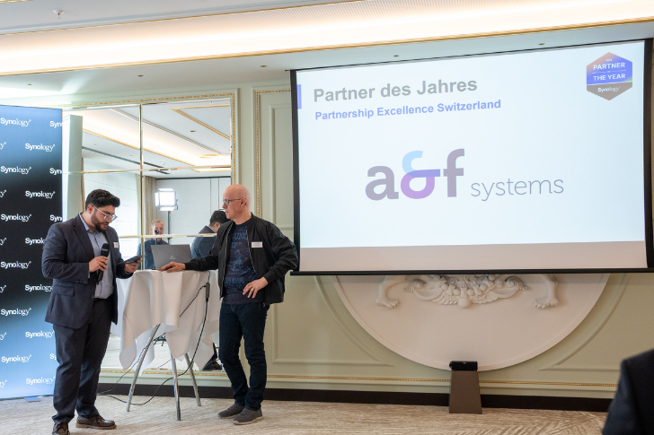 Die führenden Synology-Partner aus der DACH-Region trafen sich im Hotel Kempinski in München zur diesjährigen Preisverleihung. Nach der Eröffnung durch René Barbatello, VP Sales & Marketing DACH Synology, wurden die besten Partner des Jahres ausgezeichnet. Für uns ein ganz besonderer Moment: Die a&f systems ag wurde als «Partner of the Year 2025 Switzerland» ausgezeichnet. Die Laudatio hielt Ismail Kusu, Channel Account Manager, der den Award anschliessend stellvertretend für das gesamte Team an a&f-System-Consultant Guido Steger überreichte.
